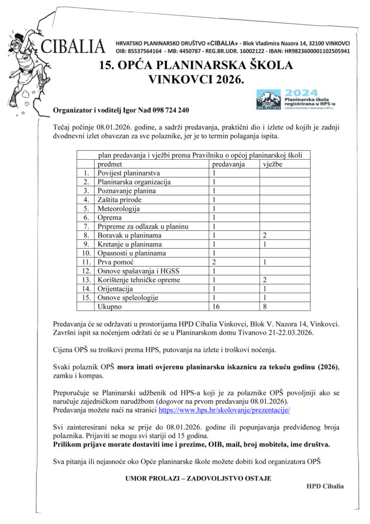 Tečaj 15. opće planinarske škole Vinkovci 2026. započet će u četvrtak, 8. siječnja 2026. godine u prostorijama HPD Cibalia, u Vinkovcima, Blok Vladimira Nazora 14.