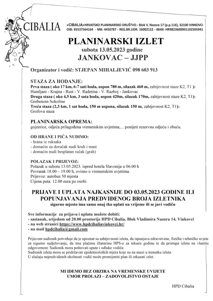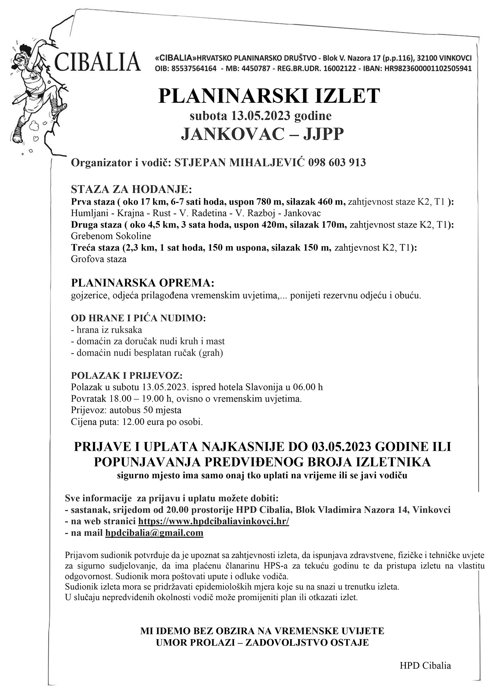 U subotu, 13. 05. 2023. godine, održava se Jubilarni jankovački planinarski put na kojem su planirana hodanja na tri staze: