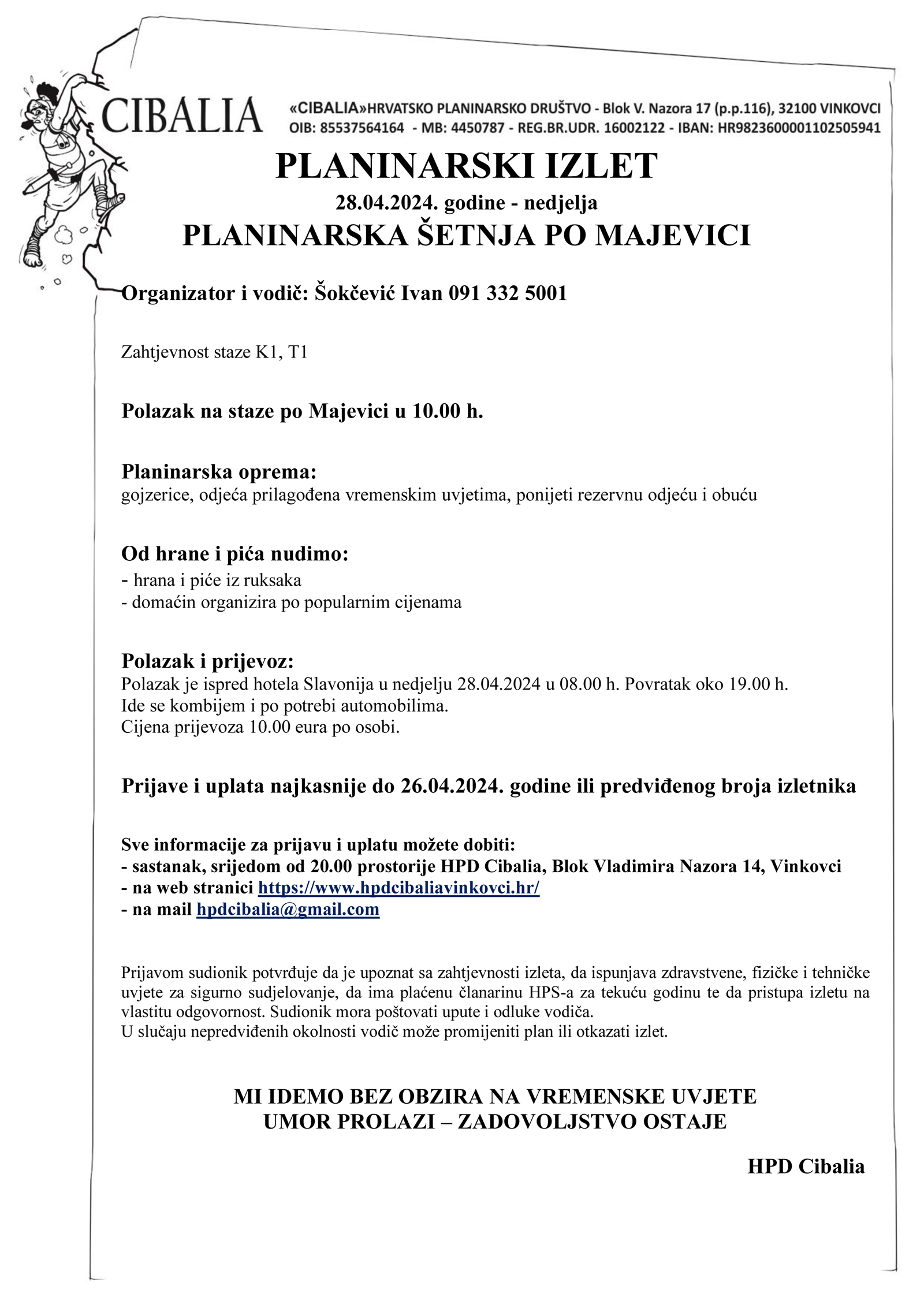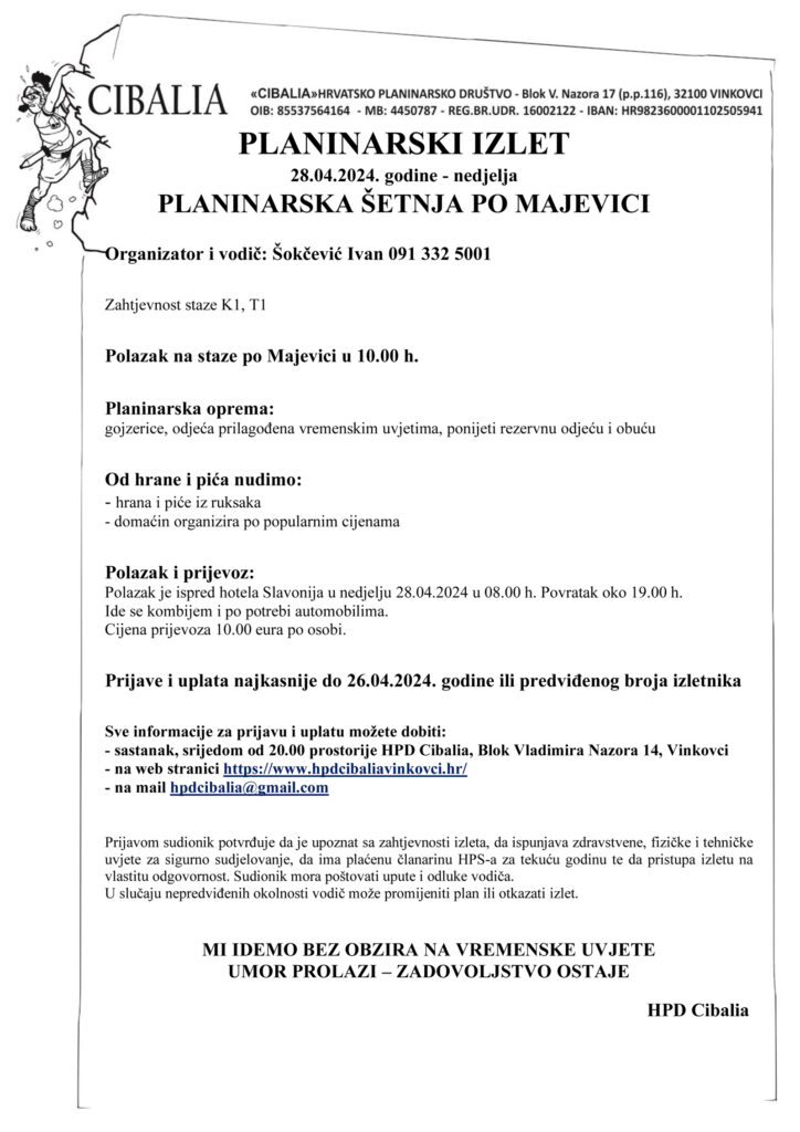 Prijava i uplata najkasnije do 26. travnja 2024. godine, cijena prijevoza 10,00 eura po osobi.