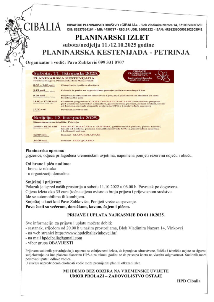 Za vikend 11. i 12. listopada 2025. godine, predviđen je izlet u Petrinju na Planinarsku kestenijadu.