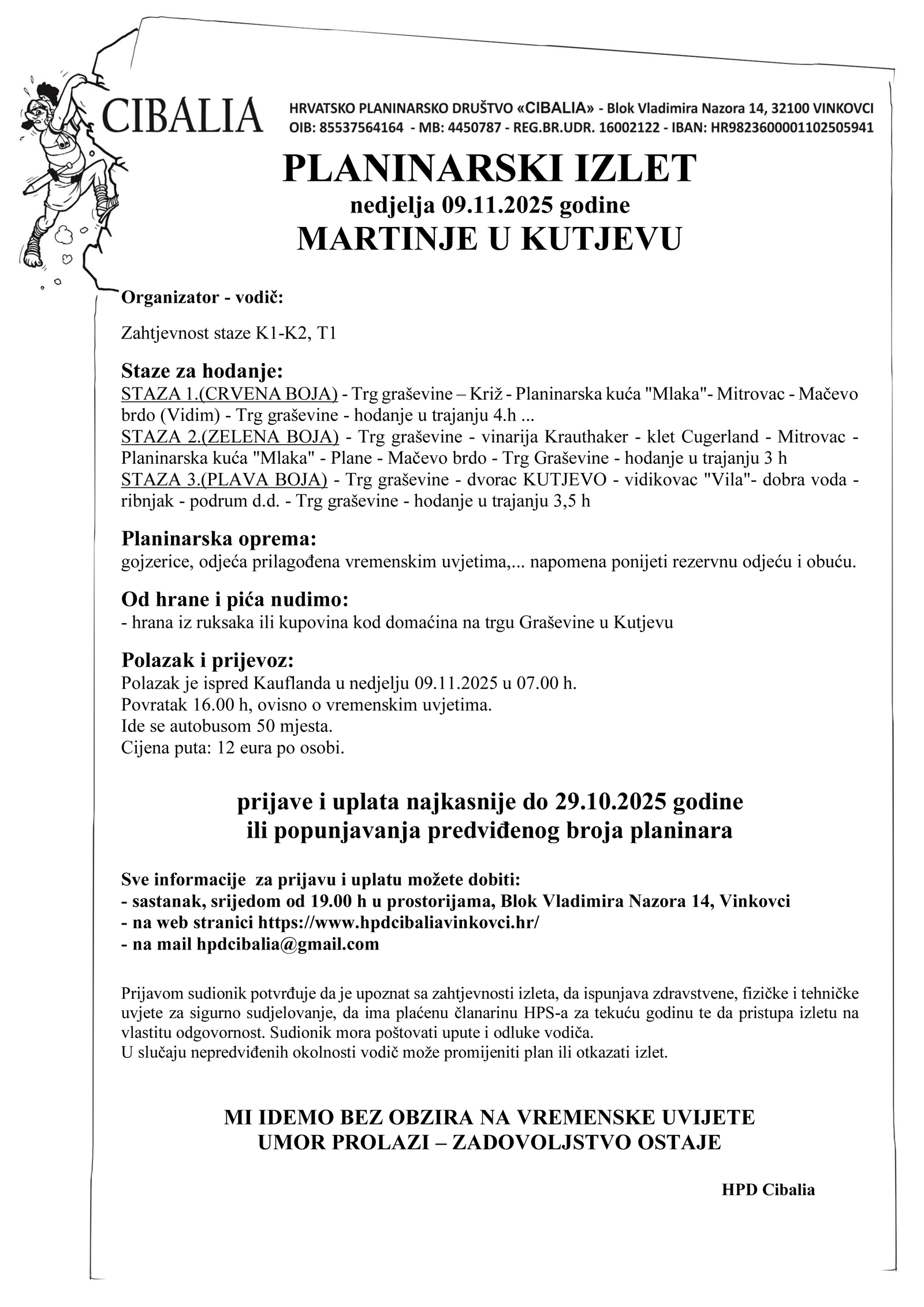 Prijave i uplata najkasnije do 29. listopada 2025. godine ili do popunjavanja predviđenog broja planinara.