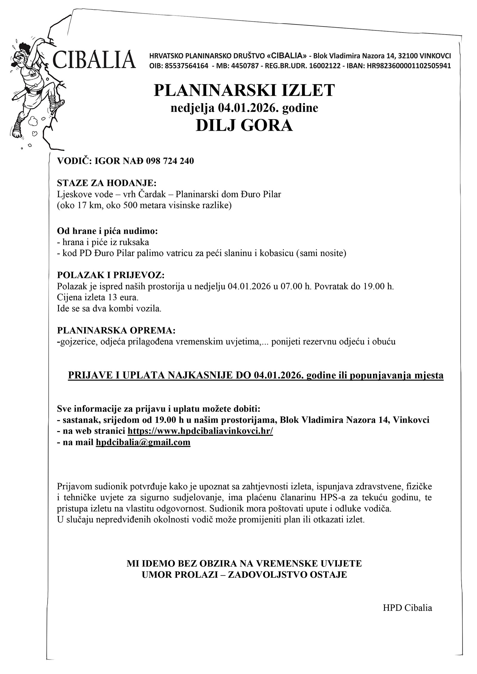 Prvi izlet u 2026. godini organizira se na Dilj goru 4. siječnja 2026. godine (nedjelja). Ide se od Lijeskovih voda do vrha Čardak pa sve do Planinarskog doma Đuro Pilar u Slavonskom Brodu.