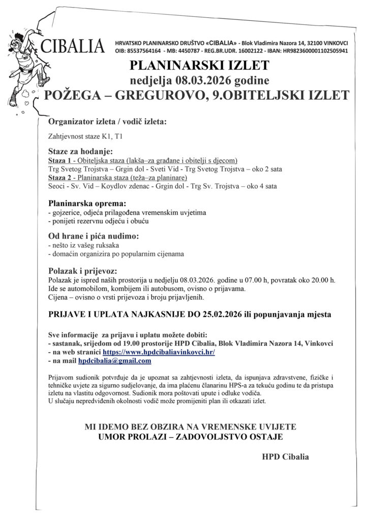 U nedjelju, 8. ožujka 2026. godine, ide se na tradicionalni 9. obiteljski izlet Gregurevo – Požega.