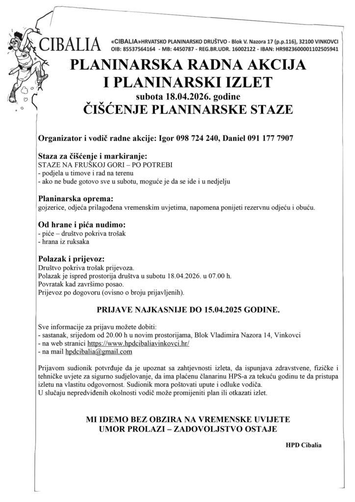 Prvo ovogodišnje uređenje i održavanje staza na obroncima Fruške gore, organizira se u subotu 18. travnja 2026. godine. Čištit će se staze za koje se procjeni da su prioritet za održavanje, u slučaju da se sve ne stigne obaviti u subotu, po dogovoru će se organizirati još jedan dan održavanja.