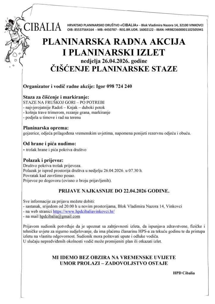 Nastavak radne akcije na uređenju planinarskih staza na Fruškoj gori organizira se u nedjelju 26. travnja 2026. godine.